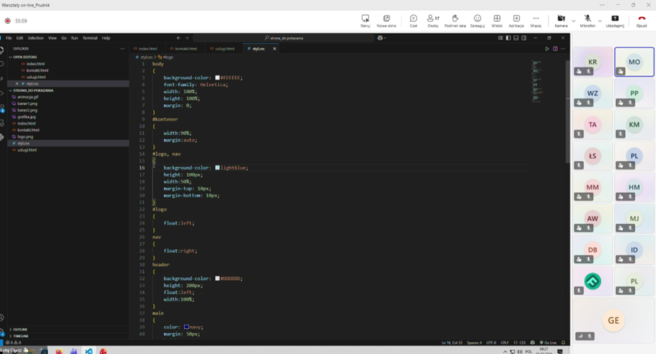 Drugi dzień warsztatów koncentrował się na projektowaniu stron internetowych. Zajęcia rozpoczęły się od krótkiego podsumowania pierwszej części warsztatów, a następnie uczestnicy poznali podstawy pracy w programie Figma – narzędziu wykorzystywanym do projektowania interfejsów i prototypów stron internetowych. Omówiono również blokową strukturę stron internetowych, w tym elementy takie jak div, main czy header. W dalszej części zajęć uczestnicy zapoznali się z funkcjonalnościami programu oraz rozpoczęli tworzenie własnych projektów.